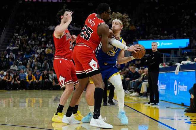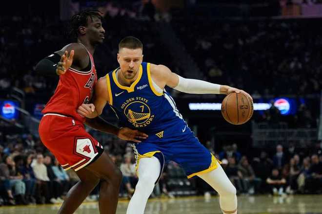 勇士过去两场连续客场输给雷霆与爵士遭遇2连败,公牛上一场客场110-126输给国王,本赛季首次交锋勇士客场123-91大胜公牛。本场勇士缺少库里兄弟、波尔津吉斯、巴特勒等,公牛缺少西蒙斯、艾维与科林斯。首节开局,追梦与桑托斯接连三分命中取得8-3领先,公牛连得6分反超。双方交替领先缠斗至勇士18-15,公牛一波7-0攻势反超4分。勇士内外开花一波12-4攻势夺回领先,首节比赛结束勇士30-26领先公牛。首节勇士三分18中8,但两分仅6中1,公牛26中11,其中三分14中4。