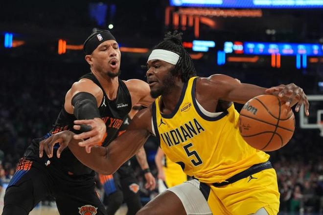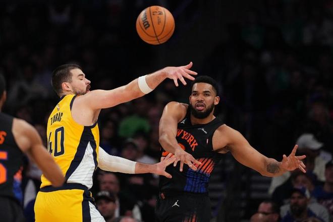 尼克斯过去3场连赢爵士、步行者与勇士收获3连胜,步行者过去13场遭遇13连败,本赛季前3次交锋尼克斯2胜1负处于上风。本场尼克斯缺少布伦森与麦克布莱德,步行者缺少西亚卡姆、内姆哈德、哈利伯顿。双方首节早早开启对攻模式,两队首节均是单节得分30+,尼克斯更是完成本场唯一一次单节得分35+表现。尼克斯持续保持微弱领先优势,首节结束尼克斯38-34领先步行者。