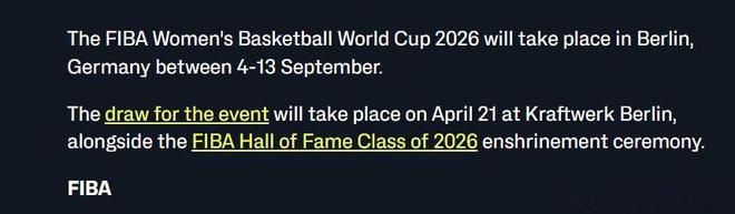 宣布2026年女篮世界杯正赛将于9月4日至13日在德国柏林开始。