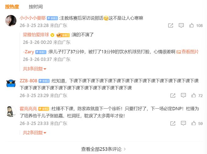 可能很多球迷不知道,胡明轩和张皓嘉是杜锋经纪公司旗下的球员,还有杜润旺也是。所以不管胡明轩、张皓嘉、杜润旺表现多差,还是有充足的上场时间。赛后,广东宏远官方账号被球迷攻陷了,很多球迷留言杜锋下课。