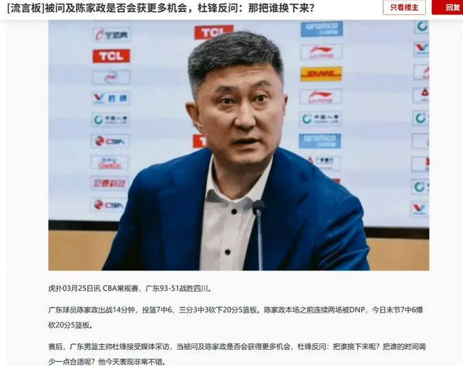 杜峰指导目前仍然处于风口浪尖上,本场继续让张皓嘉首发,并且打了全队最长的时间,各种失误和犯规,但是杜峰指导就是给予张皓嘉信任,就是一直打,一点不给年轻球员机会,最后一节拉开到了三十分才换上了年轻的球员,并且最后一节的比赛当中,张文逸和陈家政的发挥都比张皓嘉强太多了,陈家政能防守能进攻,并且一点不手软,第四节单节得到了20分,这样的表现居然连续被弃用,也是让很多的记者怀疑,赛后直接问了杜指导陈家政这样的表现以后会不会有更多的上场的机会?