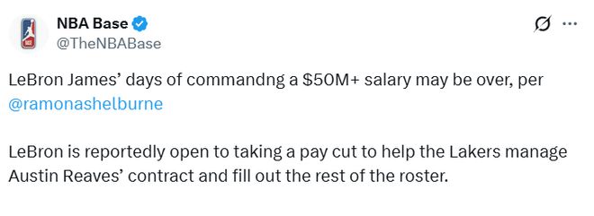 北京时间3月24日,ESPN名记谢尔本报道,詹姆斯拿5000万美元以上年薪的日子可能已经结束了。报道称,詹姆斯愿意接受降薪,以帮助湖人处理里夫斯的续约合同,并为球队填充阵容腾出薪资空间。