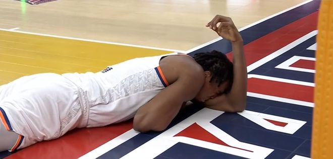 在比赛胜负已定的情况下,大卫詹姆斯依旧奋力防守,但这次他没有防对地方,在封盖胡金秋的过程中,直接一巴掌拍中了大秋的脑门,胡金秋应声倒地不起,跪倒在地上捂着脑袋久久无法起身,而离谱的是,裁判当时就站在底角,也清楚目睹了这一切,却没有响哨,一点表示都没有。