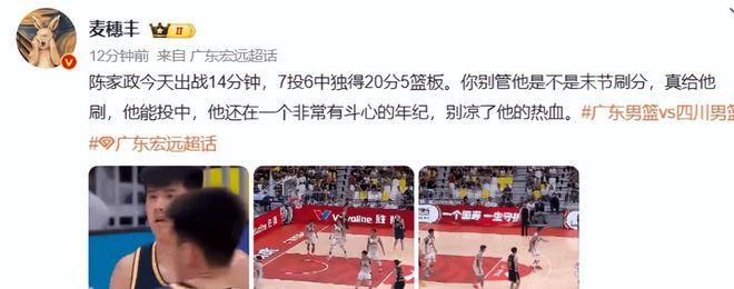 要知道,陈家政上场前,广东男篮的上半场打得那叫一个憋屈。首节13-14落后四川,半场也只以33-25微弱领先,主力们的进攻状态低迷,徐杰10投3中勉强拿分,麦考尔在场时进攻端更是一团乱麻。