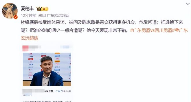 就在所有人都以为,这场封神表现能让陈家政在广东男篮获得更多出场机会时,主教练杜锋的赛后采访,却给所有人浇了一盆冷水。