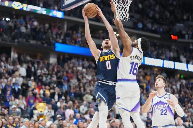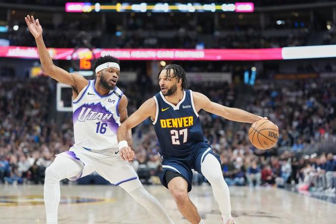 掘金过去4场连赢猛龙、开拓者、太阳与独行侠收获4连胜,爵士过去3场连续主场输给76人、猛龙与奇才遭遇3连败,本赛季前两次交锋掘金均战胜爵士。本场爵士缺少马尔卡宁、努尔基奇、乔治等多位主力,首节前6分半钟双方紧咬比分,持续缠斗至掘金19-18领先。约基奇攻传结合扩大26-20领先,爵士追到差4分,掘金一波9-2攻势拉开比分,首节结束掘金37-26领先爵士。首节爵士24中11,其中三分8中0,掘金29中13,其中三分11中3,穆雷15+3+4与约基奇8+7+4。