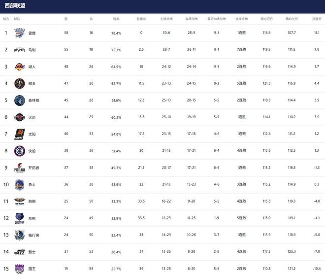 太阳落后火箭4个胜场,勇士领先11名的鹈鹕11.5个胜场,这让几支球队基本锁定附加赛席位,只是具体的排名归属还有小幅度的悬念。