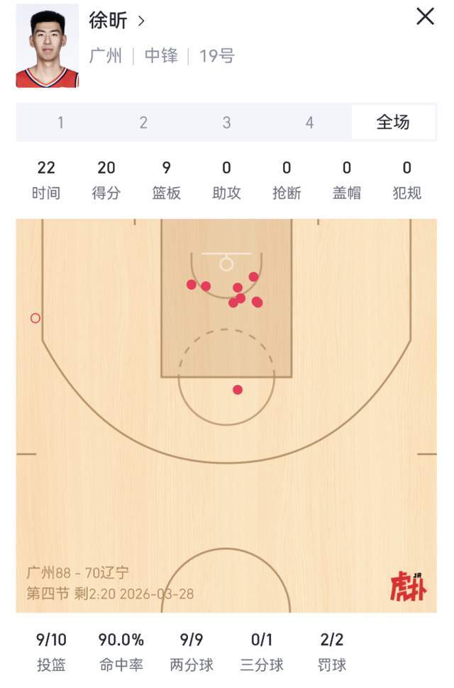 徐昕全场10投9中,高效砍下20分、9篮板(含4个前场篮板),外加2次封盖,正负值高达+29,为全队最高。他的进攻几乎全部来自篮下,三分线外1投未中,却凭借精准的接球顺下与补篮能力,将每一次触球转化为致命威胁。辽宁队的内线防守体系在他面前形同虚设——只要他落位禁区,对方必被迫双人包夹,从而为外线队友撕开巨大空档。这种“牵一发而动全身”的战术价值,远超数据本身。
