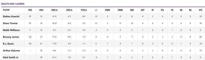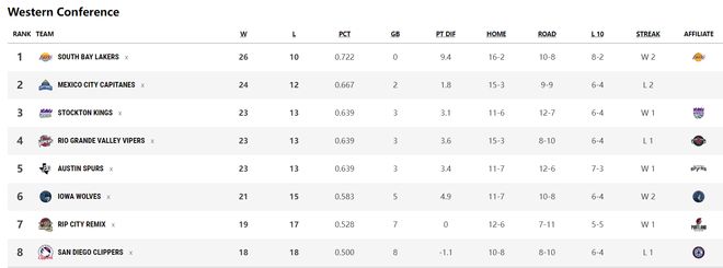 这场比赛后南湾湖人战绩26胜10负稳居西部第一,南湾湖人领先西部第二的墨西哥船长队2个胜场,东部第一的奥西奥拉魔法队战绩也是26胜10负,所以湖人与魔法是并列联盟战绩第一的存在。