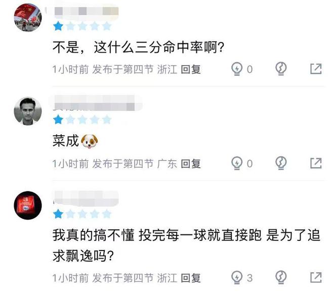 本轮广厦以94比109不敌深圳的比赛,在小外援塔克状态非常一般(10中5,仅得到18分)、胡金秋也未能扛起输出重担的情况下,赵岩昊也继续掉链子,打了16分多钟的他,9次出手仅命中3球,三分线外5中1,仅得到7分,而他每次投完一球直接就跑,也引起了球迷的热议:“真搞不懂投完每一球就直接跑,是为了追求飘逸吗?”