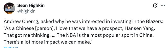 被问及为何有意投资开拓者时,程正昌表示:“作为一名华人,我很看好我们的潜力新人杨瀚森。这一点打动了我……NBA在中国是最受欢迎的体育赛事,我们能创造的影响力还有很大。”