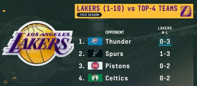 今天看到一组数据,还蛮惊讶的,本赛季湖人在打联盟前四球队的比赛中,居然只拿到1胜9负的成绩:0-3被雷霆横扫,1-3不敌马刺,对阵活塞、凯尔特人更是全败,唯一的胜场还是077单独带队赢的。