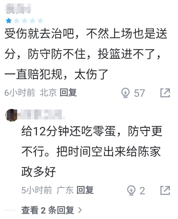 看到杜润旺攻防两端再一次毫无贡献,赛后广东球迷也是毫不留情的给阿旺打了低分,并喊话杜润旺:受伤就去治吧,不然上场也是送分,防守防不住,投篮进不了,一直赔犯规,太伤了;把时间空出来给陈家政多好。