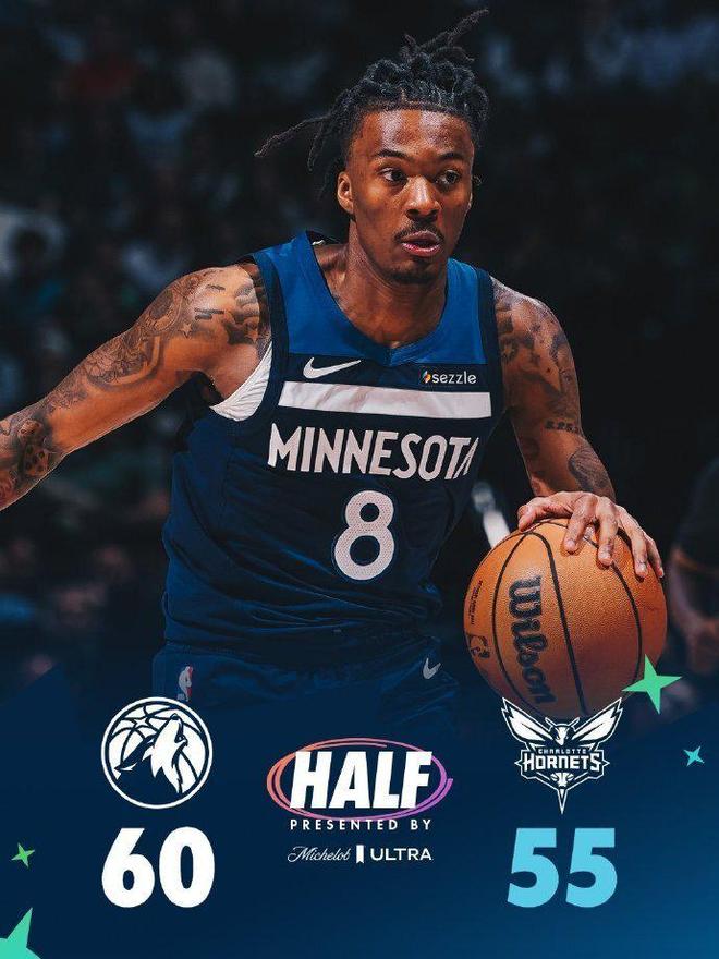 次节比赛,森林狼进攻火力大幅提升本场首次单节得分35+,且限制黄蜂连续两节单节不足30分。森林狼追到差3分,黄蜂连得4分,森林狼内外开花一波11-0攻势反超4分。双方接连冲击内线缠斗至43-43,森林狼连得4分取得领先,黄蜂反扑追分,森林狼内外开花继续保持领先。黄蜂单节26-39输掉13分,上半场结束黄蜂55-60被森林狼反超。前两节比赛,森林狼三分21中10,兰德尔14+4+2与海兰德4记三分15分;黄蜂三分23中7,三球17分与布里奇斯12分。