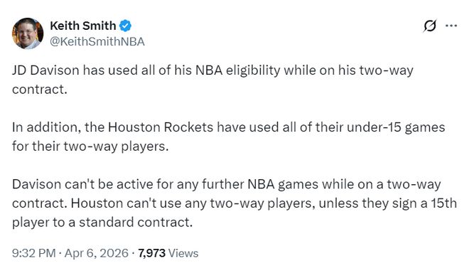 北京时间4月6日晚,根据NBA记者肯尼-史密斯的报道,JD-戴维森已经执行完了他双向合同50场NBA常规赛的额度,火箭在激活的50场中只让他打了27场,换言之戴维森已经无法为火箭出战任何的比赛,除非他们重新签下一名标准合同球员。