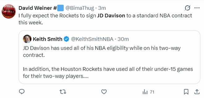 随后火箭记者大卫-韦纳转推写道:我坚信本周火箭队就会将戴维森的双向合同转为标准合同。