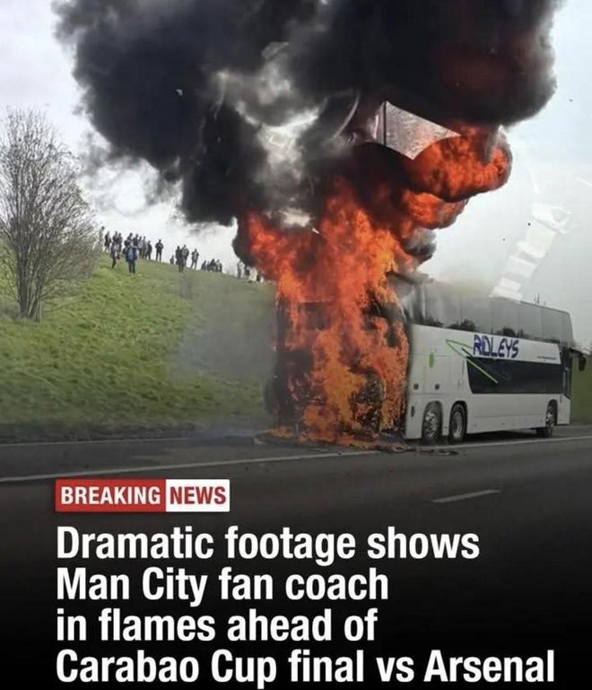 北京时间3月23日,一辆搭载曼城球迷的大巴在英国一处高速公路突发起火,打乱了球迷们前往英联杯决赛现场的行程。