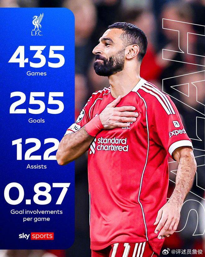 尽管本赛季状态起伏,但萨拉赫在利物浦留下的数据,足以让任何后来者仰望。效力利物浦9个赛季,435次出场,255粒进球,这是萨拉赫交出的成绩单。他位列利物浦队史射手榜第三,仅次于伊恩·拉什(346球)和罗杰·亨特(285球)。
